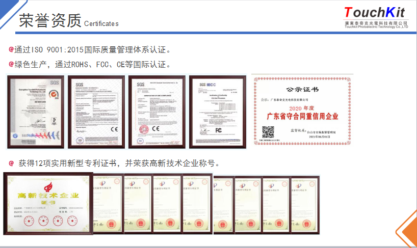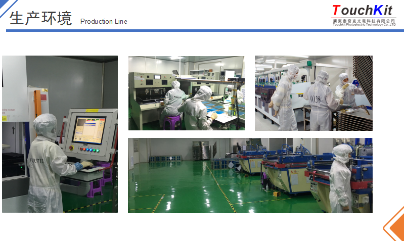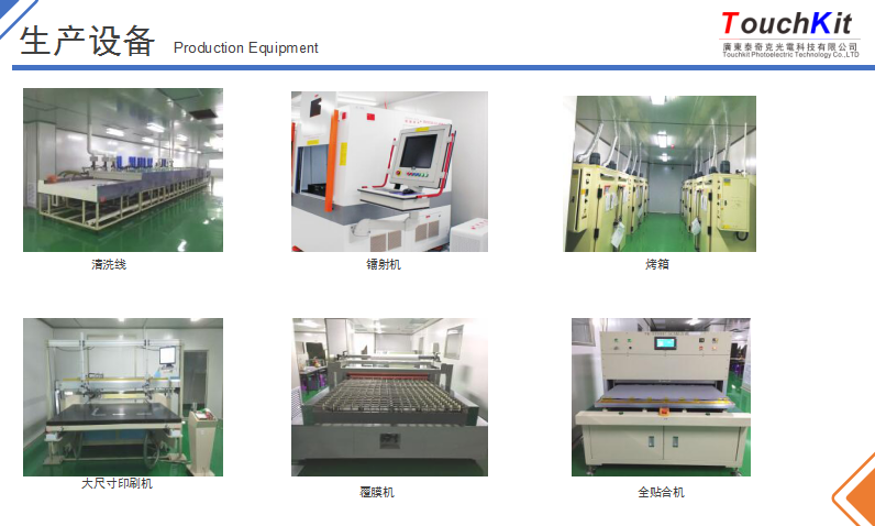 广东泰奇克光电科技有限公司,(后称”TouchKit”)是一家专注于触控产品研发设计、生产制造、销售服务的高新科技企业,为全球触控市场提供完善的触控解决方案及高品质的触摸屏产品。TouchKit 生产基地位于江门台山市台山工业新城,占地2万平方米,内含1.5万平方米全新的现代化标准厂房,并修建了第一期千级与百级高端无尘车间。TouchKit 拥有专业的研发团队、资深的技术骨干、尖端先进的全制程生产设备、高效的生产能力、严格的品质控制程序,持续改进,不断创新,以高品质、高性能、高水平的产品在市场上建立了高端的品牌形象,并赢得了国内外客户的一致好评。