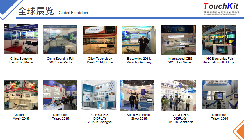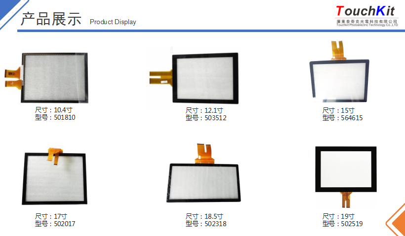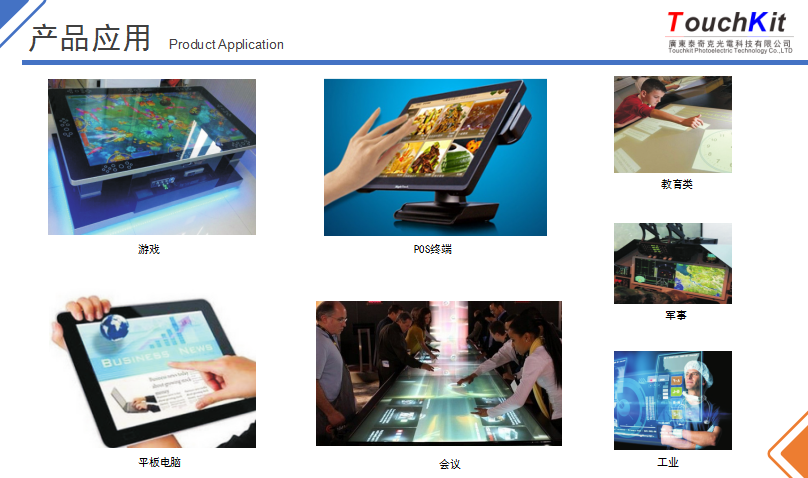 TouchKit 秉承着“精诚合作、互利、双赢”的方针,以及“以人为本,质量第一。持续改进,顾客满意”的宗旨,本着与客户同创造共繁荣的原则,TouchKit 始终致力于为客户提供多样化、客制化的高性价比产品,不仅支持各尺寸(8寸~86寸)、厚度、特殊效果(如AG、AR、AF、防水、主动笔、厨柜触摸等)产品的定制,还可以根据客户不同的行业及领域要求,开发生产相匹配的触摸屏以满足客户特定的、多样化的需要。目前 TouchKit 生产的投射式电容触摸屏已广泛应用于POS一体机、大型广告机、工控设备、医疗设备、金融设备、多媒体教育设备、军控设备、车载电子、办公家居等领域,并与国内外客户建立了长期紧密的合作关系。